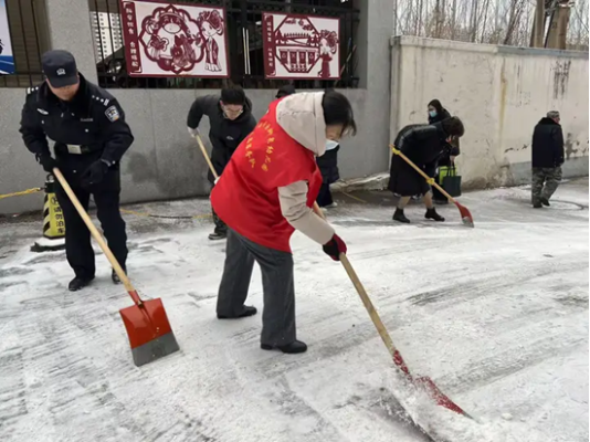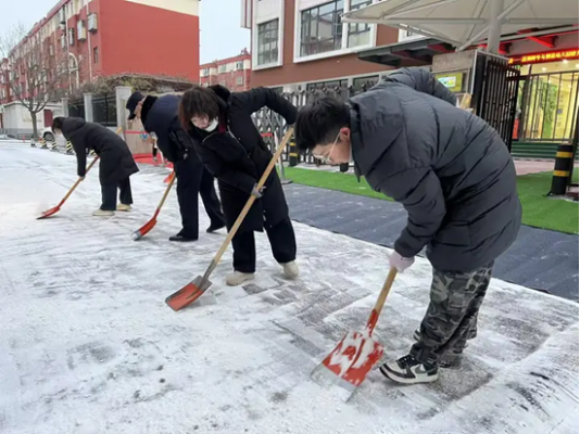破晓时分,寒意未消,为了赶在孩子们入校前扫清路障,幼儿园教职工已携带工具集结。通过默契分工、高效协作,教师们循着“全覆盖、无死角”的原则,对校门口、甬道、活动区、台阶转角等关键区域逐一清扫。得知雪情的家长志愿者们自发驰援,为了给孩子们增添一份安全保障,他们自带除雪器具加入队伍,家校携手的身影在白雪映衬下愈发坚定。更有辖区民警主动靠前,为了化解路口车流与人流的交织风险,他们既手持工具参与清雪,又在路口划定安全区域,疏导车流、指引行人,通过“清障和疏导”的双重举措,用坚守为孩子们筑起“移动安全屏障”。三方合力,通过责任的坚守、热忱的付出与担当的践行,奏响了冬日护学的暖心乐章。