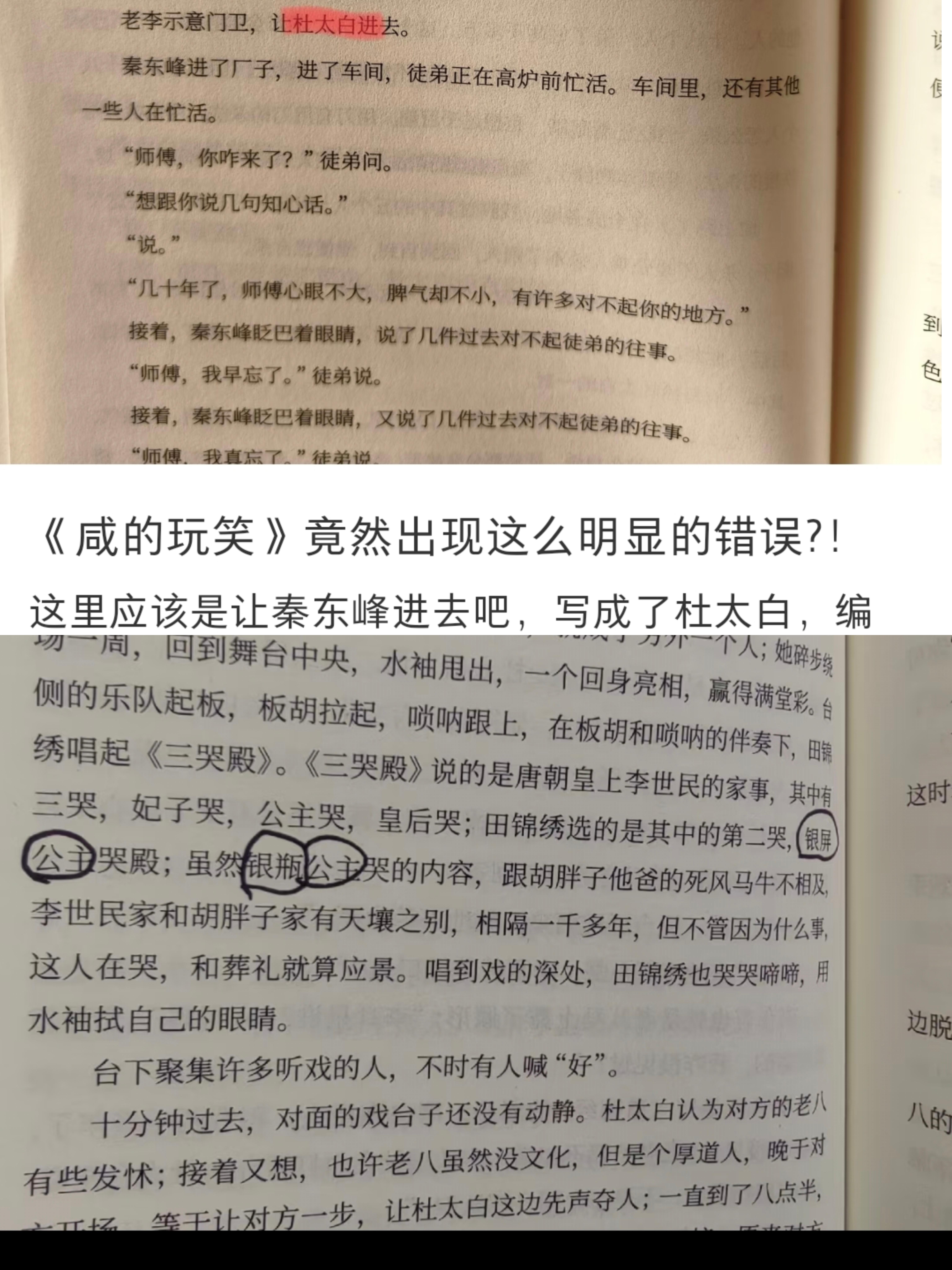 日前,有读者发帖称,《咸的玩笑》一书第398页中,将人物姓名由“秦东峰”错写成“杜太白”,引发热议。而在评论区,还有网民留言称,该书第170页提到戏曲《三哭殿》中人物也出现了错误,一前一后分别写成了“银屏公主”和“银瓶公主”,让人一头雾水。