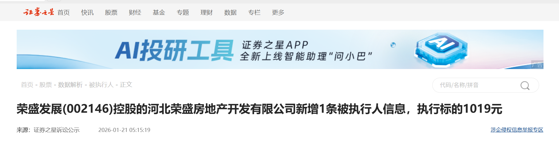 证券之星消息,根据天眼查-司法案件数据整理,1月15日荣盛发展(002146)控股的河北荣盛房地产开发有限公司新增1条被执行人信息,执行标的1019元。被执行人信息如下: