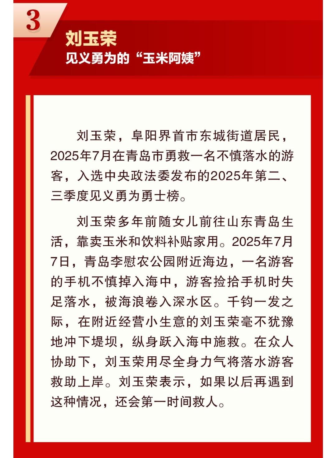 记者了解到,救人后,刘玉荣获评青岛市市南区“见义勇为积极分子”,并被授予“青岛市见义勇为模范”荣誉称号。2025年10月9日,中央政法委在京发布2025年第二、三季度见义勇为勇士榜,刘玉荣名列其中。
