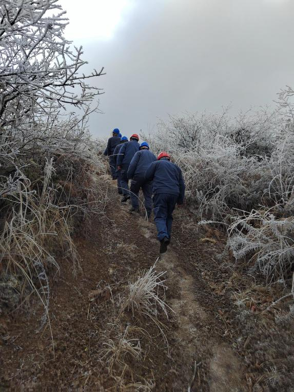 巡线现场,冰凌挂满枝头,山路湿滑难行,抢修人员采取“人工 机巡”的方式开展工作。无人机升空巡查线路覆冰全貌,地面人员徒步穿梭在覆冰丛林中,对百坪线、百鹏线等重点线路逐杆、逐段排查,仔细测量覆冰厚度、检查线路金具及杆塔基础,详细记录设备运行状况,及时清理线路通道安全隐患。
