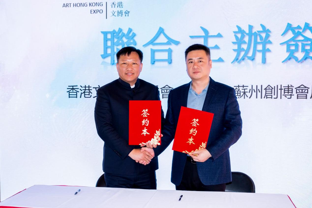 (图为:第四届香港文博会合作签约仪式,左为:香港文博会组委会执行主席皮取兵,右为:苏州国际博览中心管理有限公司副总经理/苏州创博会展览有限责任公司总经理叶喜春)