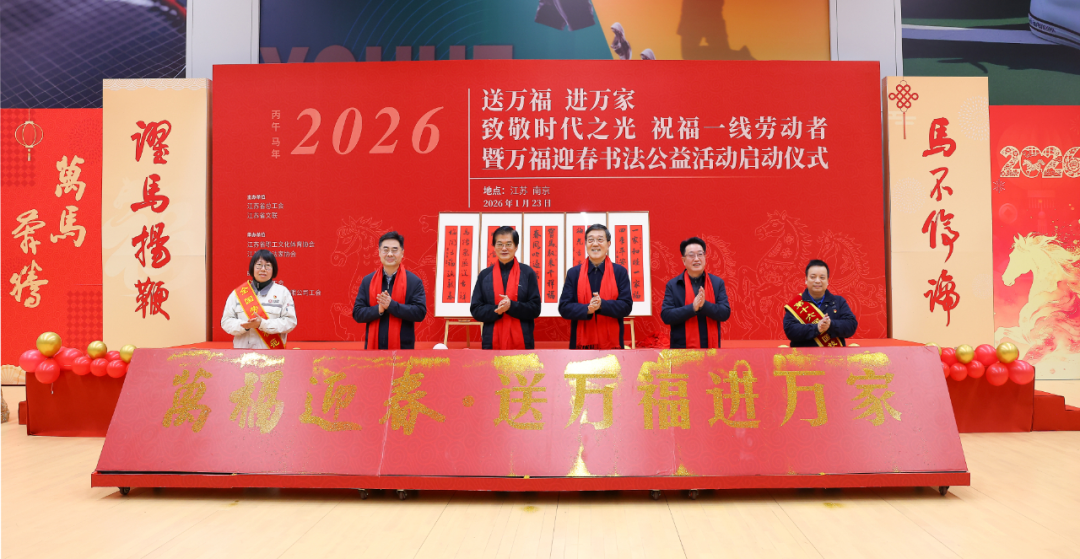 本次“致敬时代之光·祝福一线劳动者”书法公益活动暨2026丙午马年“万福迎春”“送万福 进万家”启动仪式由江苏省总工会、江苏省文联联合主办。活动在营造喜庆祥和、崇德向善的节日氛围的同时,也正式拉开了江苏省书协2026年“万福迎春”系列公益活动的序幕。