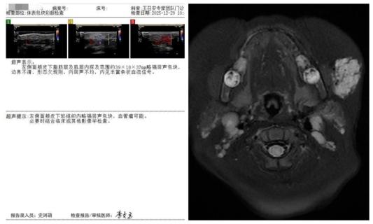 本次治疗的患儿为10月龄男婴,家长于患儿出生1个月后发现其左侧面颊部出现青色包块,初始直径约2cm(硬币大小),随月龄增长逐渐增大至4cm左右(蛋黄大小)。患儿至临沂市人民医院就诊后,经体表包块彩色多普勒超声检查,明确提示“面部血管瘤”,遂以“婴幼儿血管瘤”收住儿内科二病区。