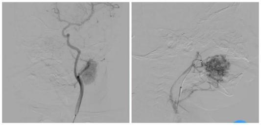 针对该患儿的病情特点与治疗需求,张庆彪主任携手刘海滨副主任医师,带领团队开展多学科术前评估、影像学分析及方案论证,最终确定采用DSA引导下介入硬化治疗方案。手术中,医疗团队依托DSA设备的实时动态成像与“精准导航”功能,经患儿股动脉穿刺建立微创通道,将微导管、导丝精准送达面部血管瘤供血动脉主干,在透视下缓慢注入硬化剂,使病灶血管内皮细胞坏死、管腔闭塞,实现“靶向根治”效果。整个手术过程历时短、创伤仅为穿刺点大小,术后患儿生命体征平稳,病灶即刻呈现萎缩趋势,疗效立竿见影。