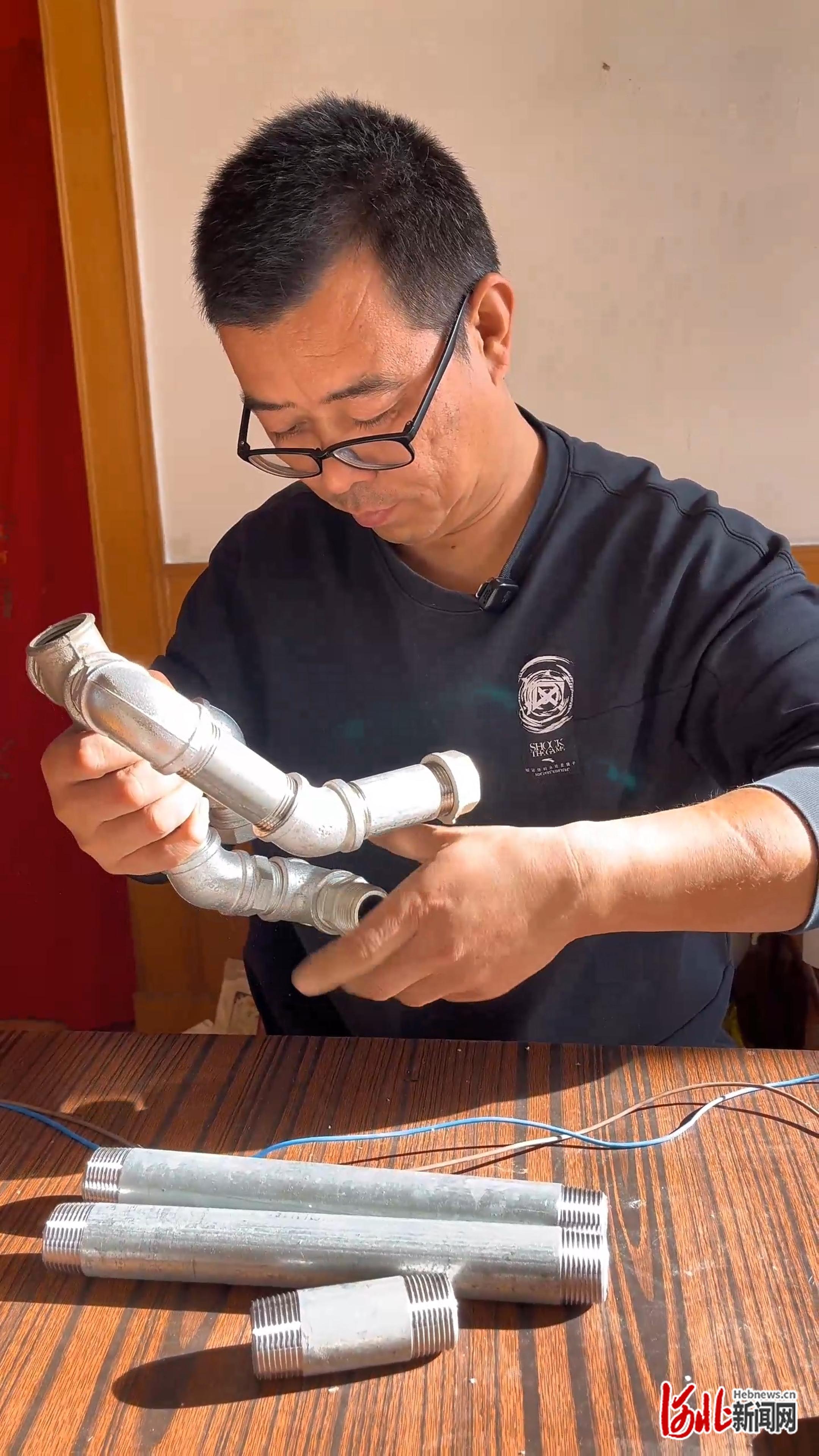 张学成和他用旧管子改造的语音照明灯。王镇供图