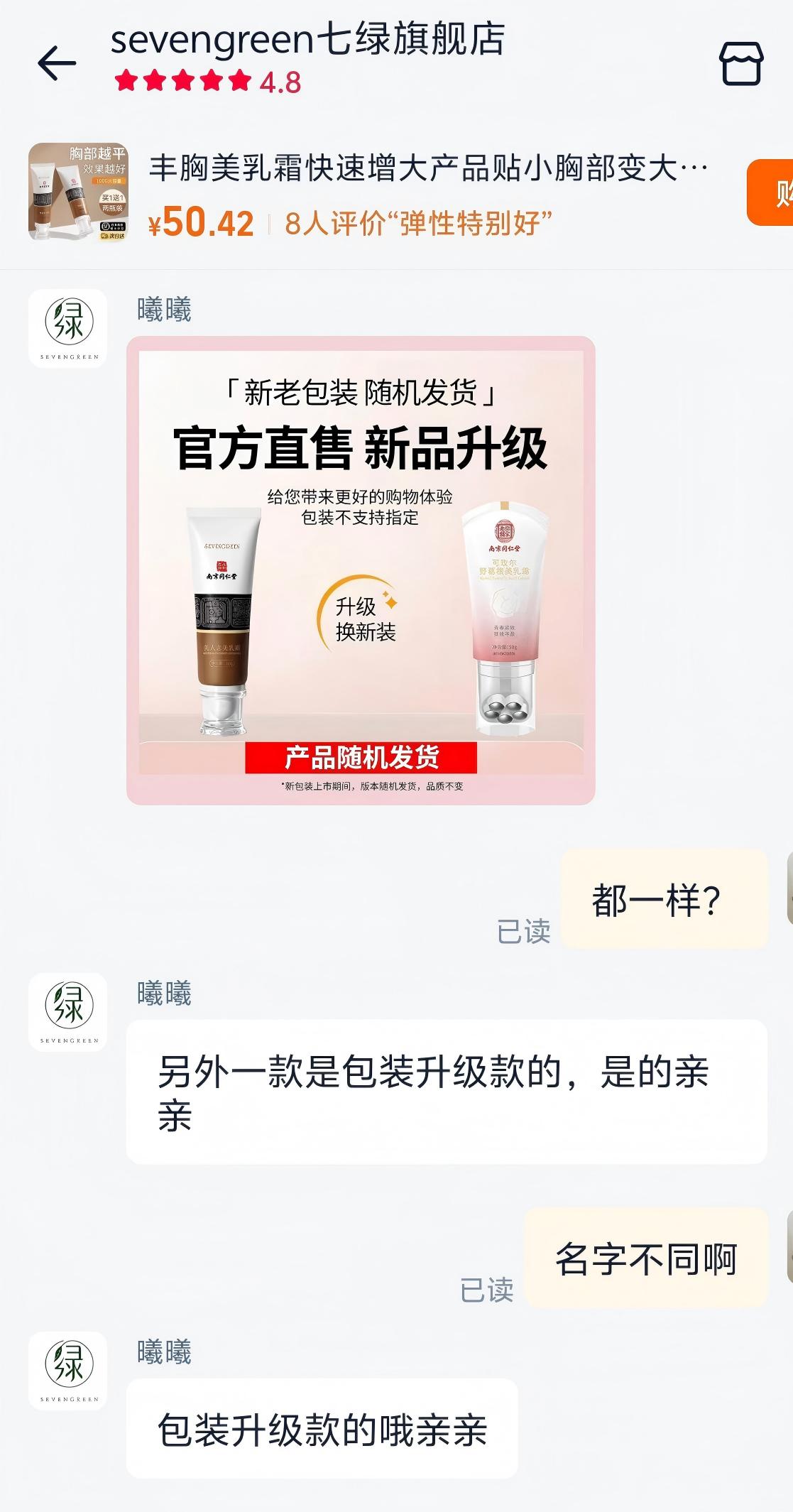 “sevengreen七绿旗舰店”客服对产品为何不同的解释。记者截图