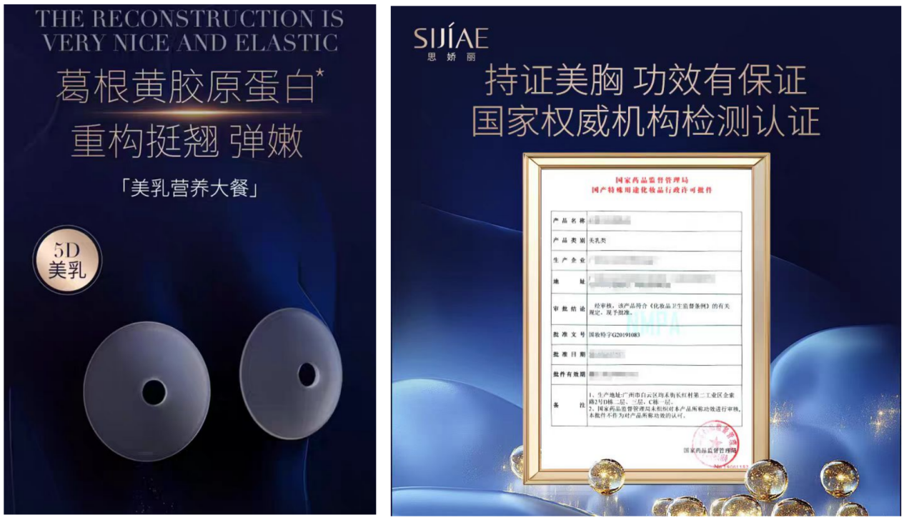 除了霜类美乳产品,胶丸状、贴片式等美乳产品在电商平台同样有销售。在美姿思娇丽(上海)美容科技有限公司经营的“思娇丽个人护理旗舰店”中,两款标注“国妆特字”的美乳产品在售,其中一款是标注“国妆特字G20140110”的思娇丽丰韵美乳霜弹弹丸,另一款是标注“国妆特字G20130448”的思娇丽美胸美乳贴。当记者对产品认证提出疑问时,客服回应称“产品持有国家食品药品监督管理局认证的‘美乳类’国妆特证。产品具有合规性、安全性和功效可信度”。