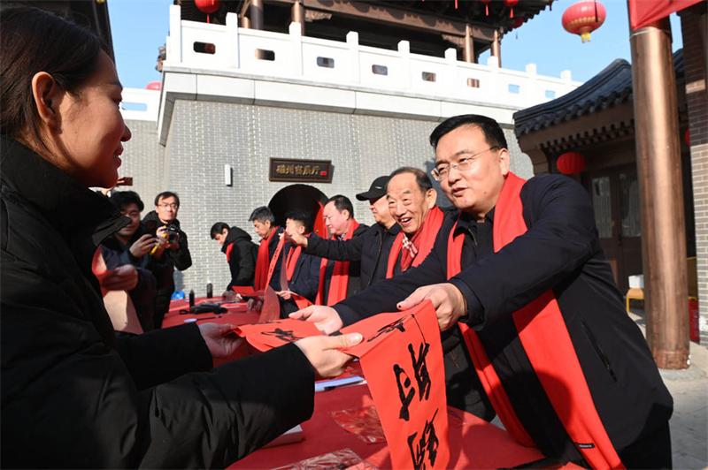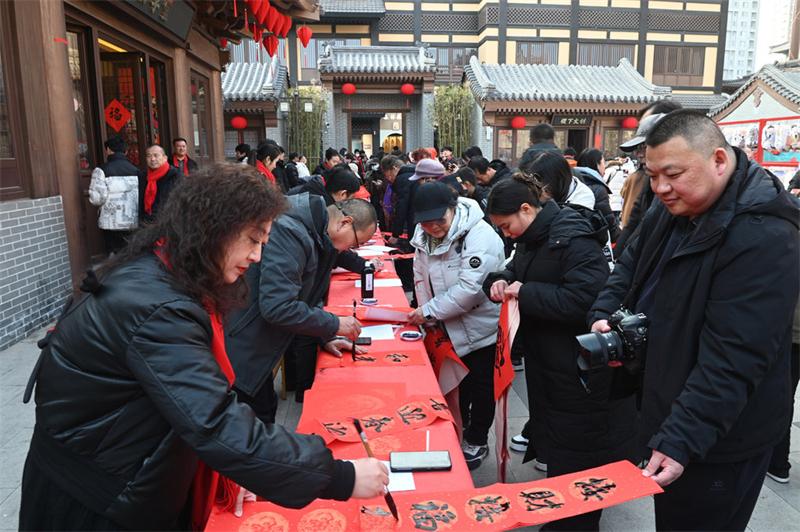 2月1日,在邯郸市邯郸道历史文化街区,书法家为市民写春联送春联。