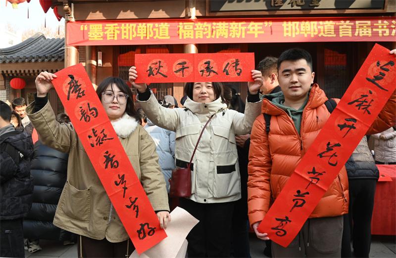 2月1日,在邯郸市邯郸道历史文化街区,市民展示刚刚领取的春联。