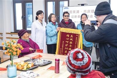 养老院的老人们送来锦旗,拉着顾盼一起合影。