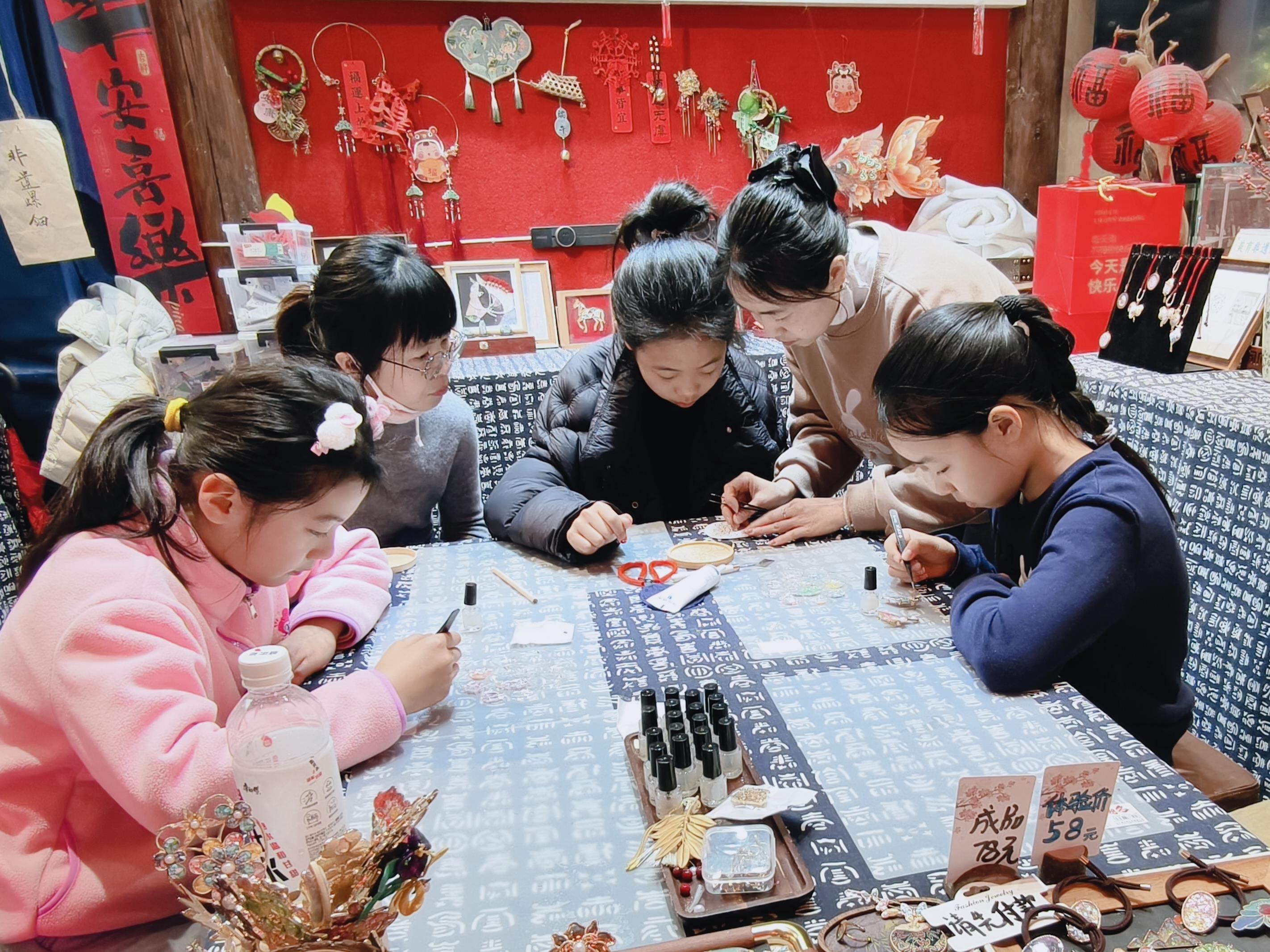 街区的非遗传习馆内,绒花、雕刻、螺钿等制作体验摊铺前挤满了人,不少家长准备在这里为孩子上新春动手第一课。一位带着女儿来体验掐丝珐琅杯垫的游客告诉记者:“58元的制作体验课,既能让孩子动手学技艺,又能把作品带回家,比买现成的礼物更有纪念价值。”