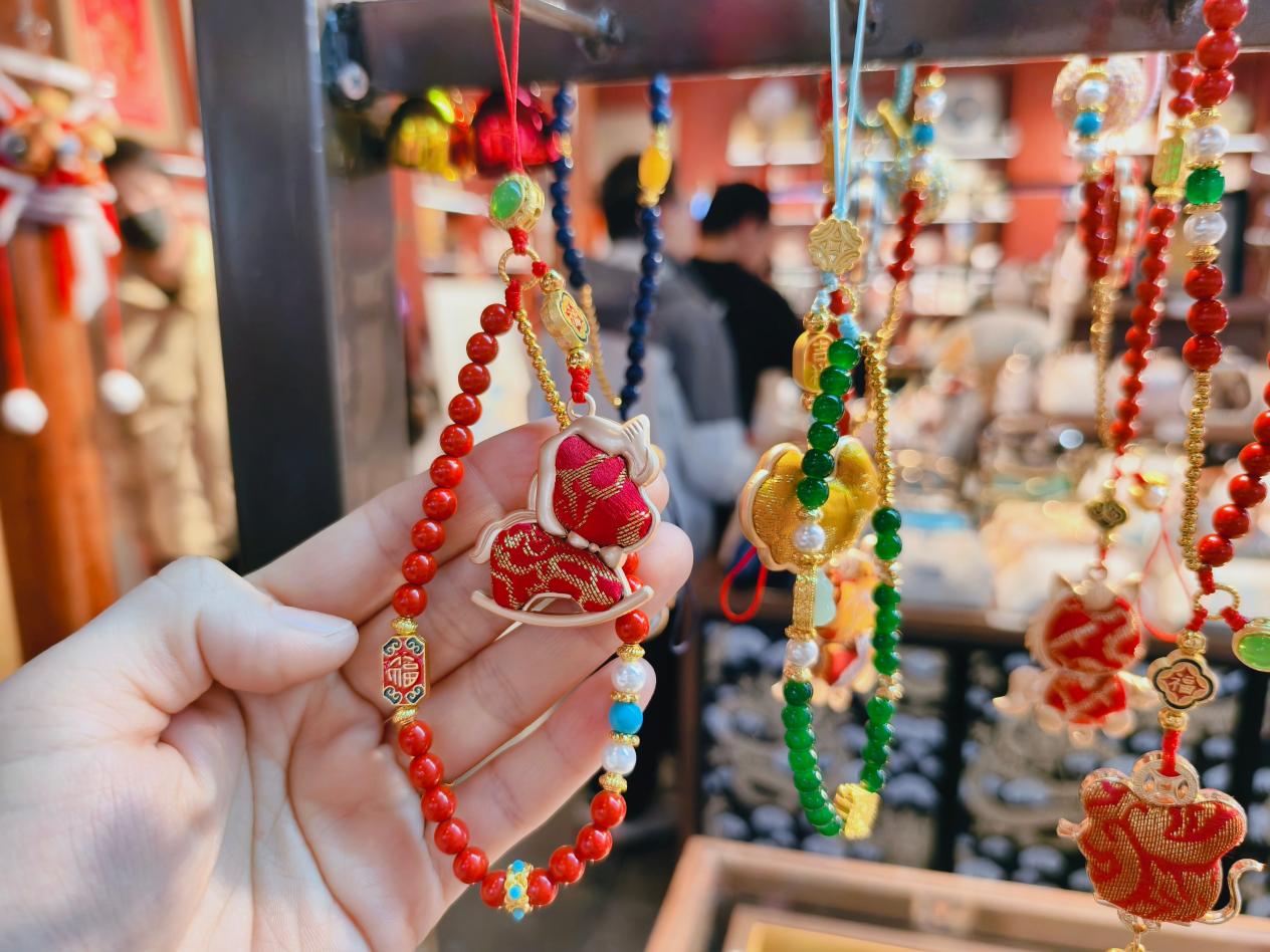 南京云锦店里,云锦材质的小马挂件、冰箱贴、手包等轻巧实用的产品备受青睐。据店员介绍,这类文创产品春节期间销售火热,很多游客都会挑上几件当伴手礼,千年云锦从馆藏品走向生活端,获得了大众的认可。