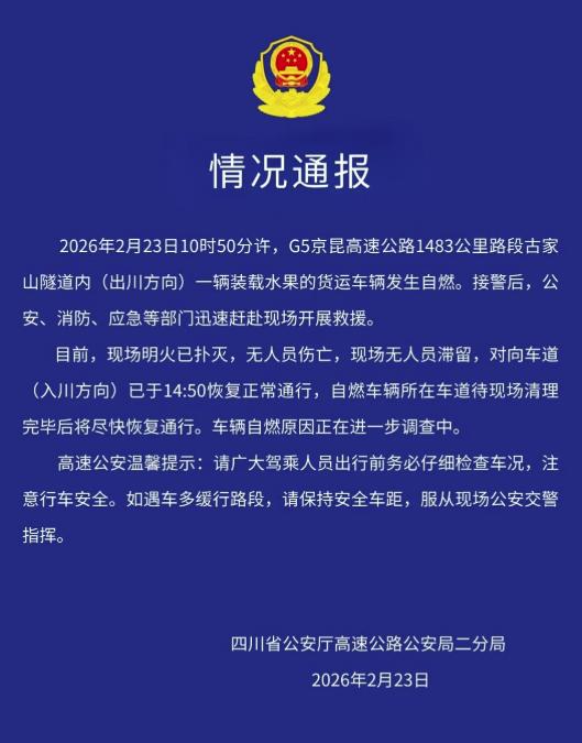 微信公众号“四川高速公安二分局”2月23日发布情况通报称,当天10时50分许,G5京昆高速公路1483公里路段古家山隧道内(出川方向)一辆装载水果的货运车辆发生自燃。接警后,公安、消防、应急等部门迅速赶赴现场开展救援。目前,现场明火已扑灭,无人员伤亡,现场无人员滞留,对向车道(入川方向)已于14:50恢复正常通行,自燃车辆所在车道待现场清理完毕后将尽快恢复通行。车辆自燃原因正在进一步调查中。