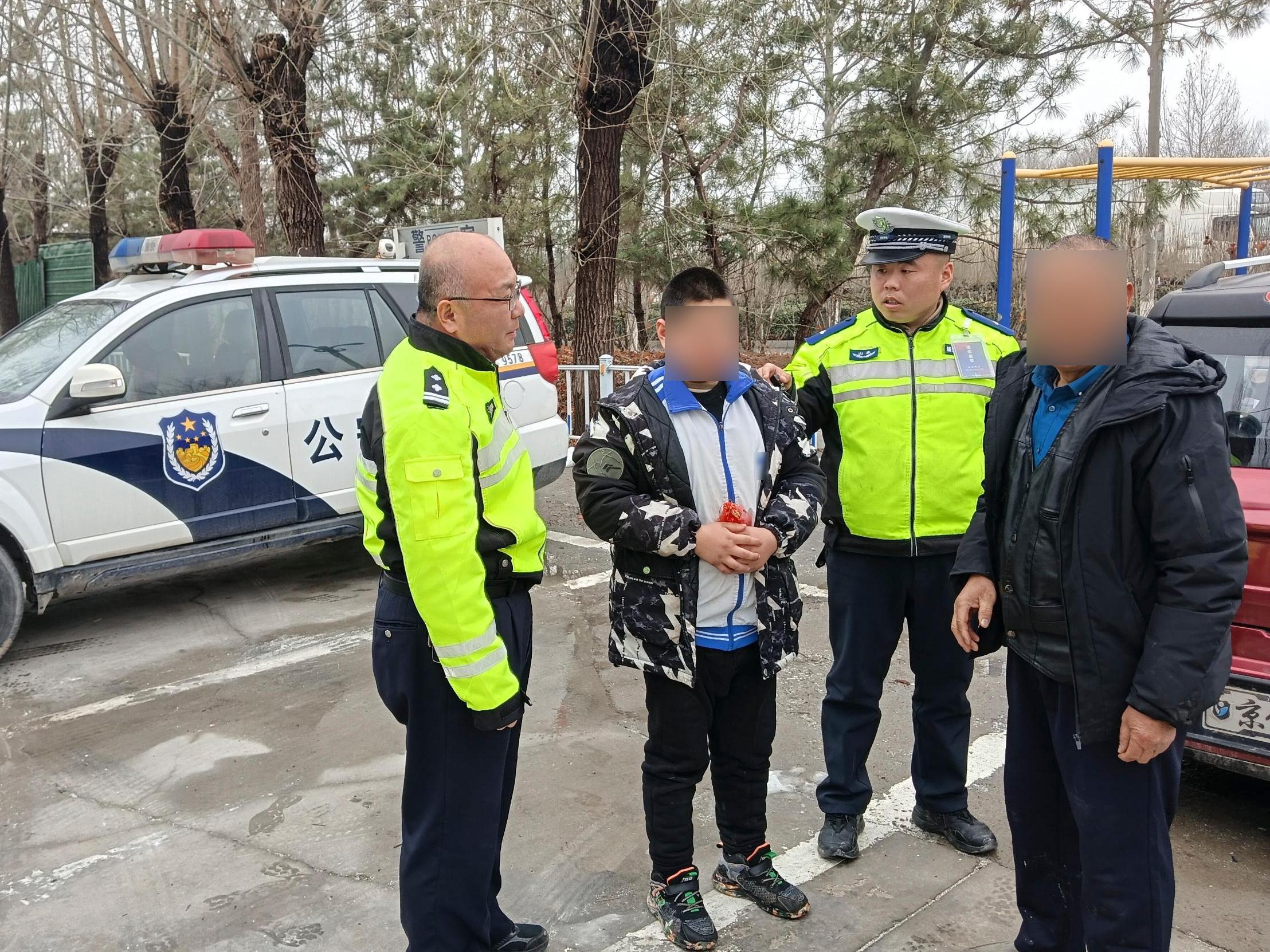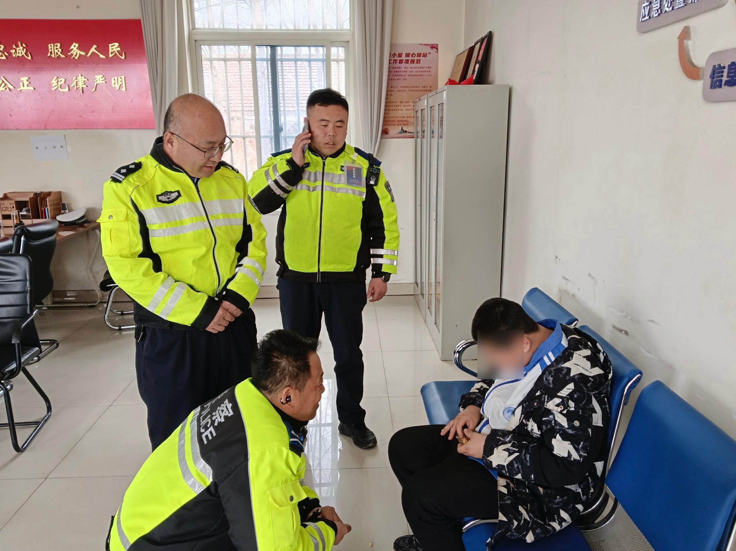 当日上午11时许,执勤一中队民辅警巡逻至闫寺铁路桥涵洞附近时,发现一名男孩独自在寒风中徘徊。见此情形,民辅警迅速下车上前查看,耐心询问其家庭信息,但男孩言语表达含糊不清。为防止发生意外,执勤人员先将男孩带回中队妥善安置。