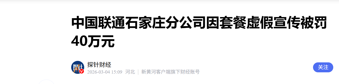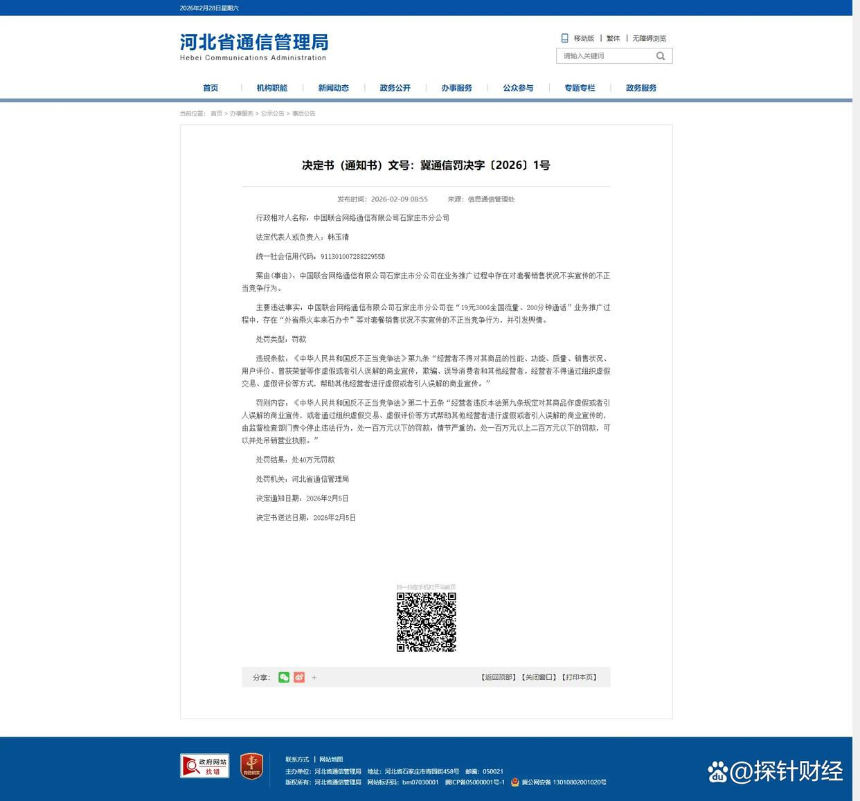 近日,河北省通信管理局官网披露一则行政处罚信息(文号:冀通信罚决字〔2026〕1号),中国联合网络通信有限公司石家庄市分公司(以下简称“联通石家庄分公司”)因在业务推广中存在套餐销售状况不实宣传的不正当竞争行为,被依法处以40万元罚款。