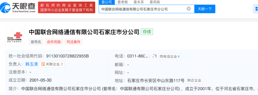 公开信息显示,联通石家庄分公司成立于2001年5月30日,位于石家庄市长安区中山东路117号,经营范围涵盖基础电信业务、增值电信业务、通信及信息相关系统集成、设备销售维修、技术服务、电信卡制作销售、房屋租赁、号码簿出版及广告业务等。