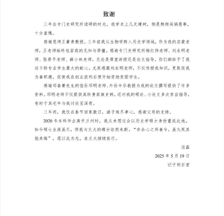 在文末,谈磊还引用屈原《离骚》中的经典名句“亦余心之所善兮,虽九死其犹未悔”明志,表示愿以此为志,在兰大继续前行。
