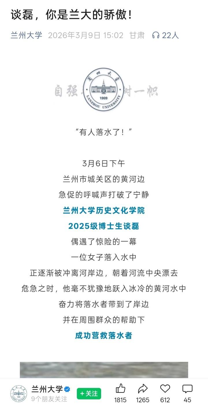 记者还了解到,谈磊如今已是兰州大学中国史专业博士生。3月9日,兰州大学官方微信公众号以《谈磊,你是兰大的骄傲!》为题公开发文点赞谈磊救人的义举。文章还介绍说,当日上午,兰州大学在城关校区召开了谈磊同学先进事迹表彰座谈会,兰州大学校长杨勇平等出席会议。会上,杨勇平首先转达了甘肃省委书记胡昌升对谈磊同学先进事迹的高度评价,并代表学校和党委书记马小洁向谈磊同学表示敬意和问候。