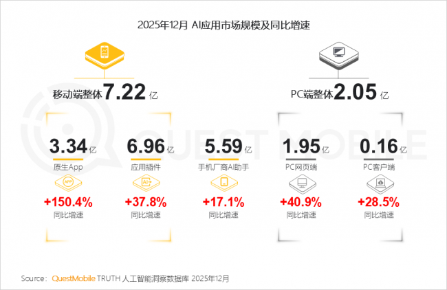 4.1 截至2025年12月,移动端AI整体规模7.22亿,PC端2.05亿;移动场景正成为承载AI体验的核心入口,并将互联网企业与手机厂商推向竞合关系的新起点