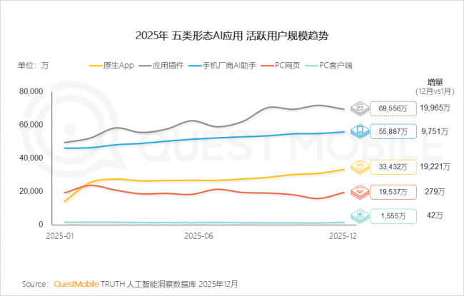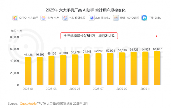 QuestMobile数据显示,2025年12月,6大手机厂商旗下AI助手月活跃用户规模较年初合计增长9751万,增速达21.1%。