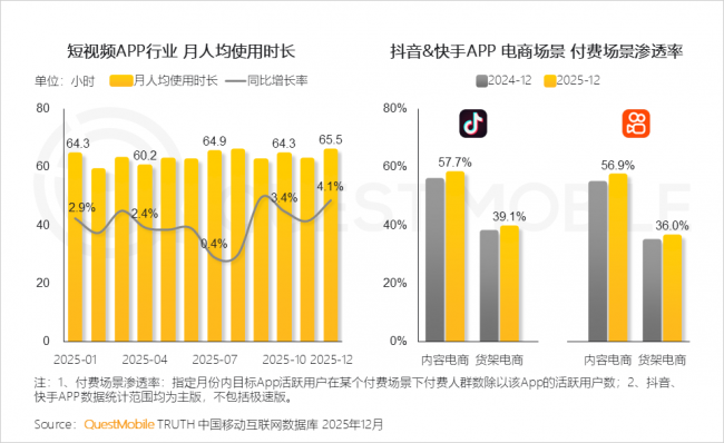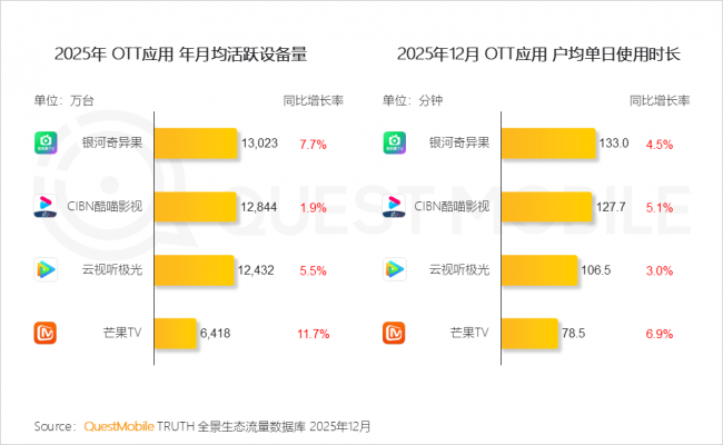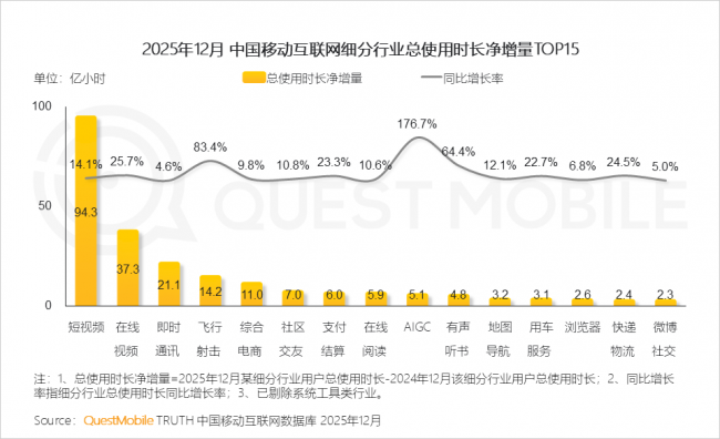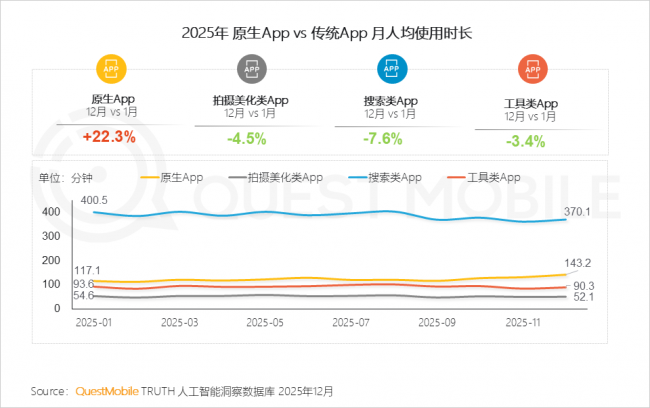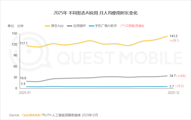 QuestMobile数据显示,2025年12月,原生App端月人均使用时长较年初增长了26.1分钟。