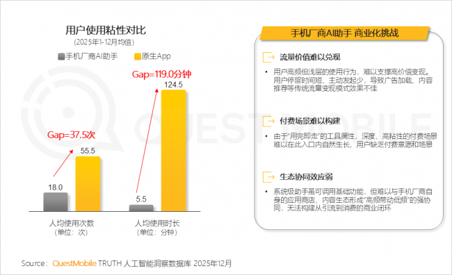 4.6 但相比原生App,手机厂商AI助手在功能深度、用户粘性上表现“乏力”,叠加商业转化路径商不明朗,面临流量变现、付费场景构建及生态协同的多重挑战