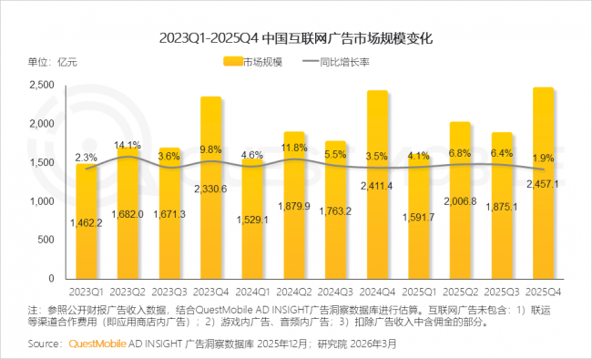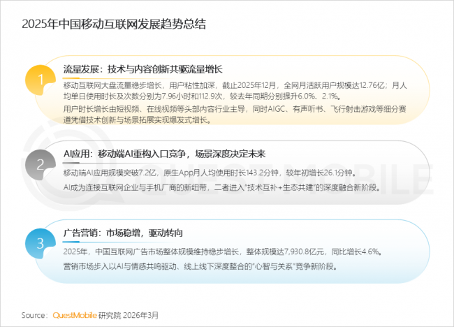 QuestMobile数据显示,2025年中国互联网广告市场规模达7,930.8亿元,同比增长4.6%。