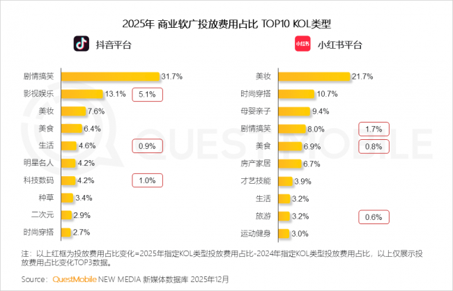如在抖音追求泛娱乐爆款与垂类增长双轮驱动,在小红书深耕生活方式与核心消费垂类。同时,2025年平台内软广投放KOL类型分布相对稳定。