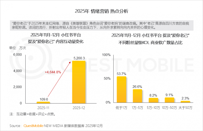 2025年11月,“爱你老己”相关内容在社交平台走红,12月话题进入全面扩散阶段,网友积极共创推动热度持续走高,带动互动显著提升。品牌借势该话题营销,在KOL选择上侧重与KOC及素人合作,以更贴近用户的沟通方式传递产品信息。