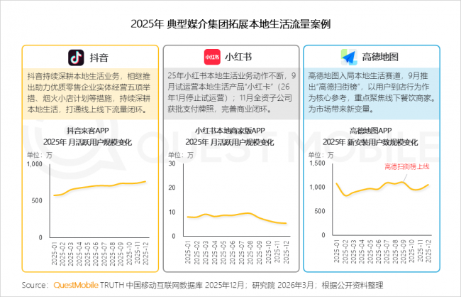 抖音、小红书、高德地图等头部媒介平台纷纷发力本地生活赛道,积极将线下消费场景纳入线上流量运营体系,通过数字化技术深挖线下流量价值,寻找业务新增量。