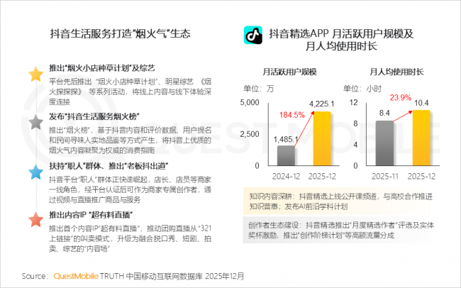 Ⅲ. 抖音将内容场与交易场深度融合,通过优质内容、榜单驱动消费决策;在专业化内容建设上,抖音精选深耕深度、知识性内容,实现用户规模与使用时长的高增长