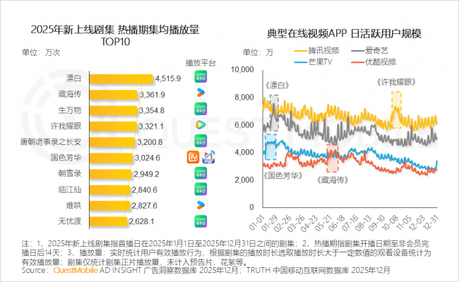 爱奇艺《漂白》、优酷《藏海传》、腾讯视频《许我耀眼》、芒果TV《国色芳华》分获各平台年度集均播放量冠军。