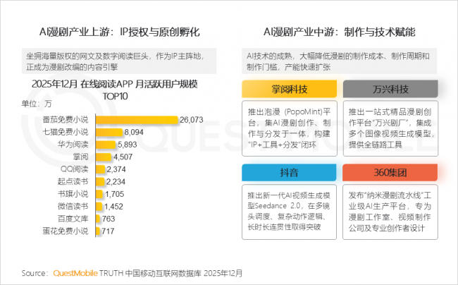 Ⅴ. AI漫剧上游的核心是IP资源与版权运营,在线阅读平台凭借用户基础与原创内容,构成漫剧IP改编的资源库;中游则以内容制作与技术应用为核心,AI技术掀起产能效率革命
