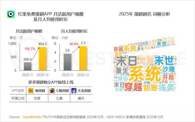 Ⅵ. 漫剧独立APP涌现,红果免费漫剧APP月活跃用户数单月净增超500万,月人均使用时长环比增长46.8%;内容题材上,漫剧呈现多元化、短平快的内容风格