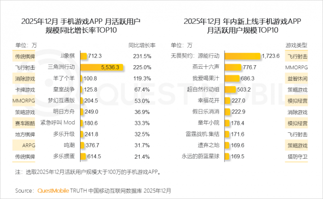 Ⅱ. 当前手游市场流量增长多赛道多点开花,《JJ象棋》《三角洲行动》《羊了个羊》用户规模翻倍增长;新游市场中,《无畏契约:源能行动》流量超1700万,益智休闲、模拟经营类游戏凭借低门槛、强解压特性快速获客