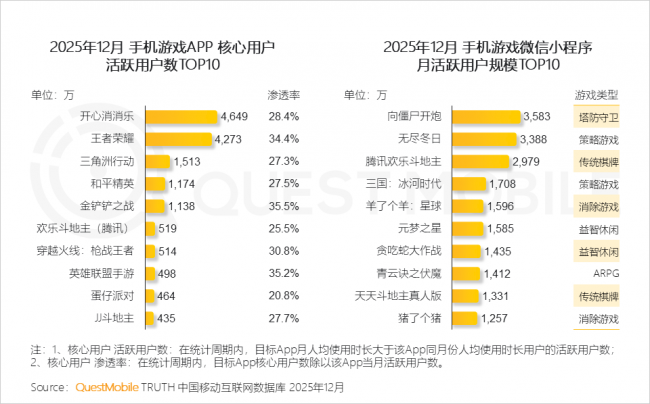 Ⅲ. 头部手游高粘性、高活跃度玩家群体,以《王者荣耀》为代表的竞技类游戏核心用户渗透率突破30%;TOP10微信小游戏流量均超千万,塔防、策略、消除、益智休闲四大轻量品类主导榜单