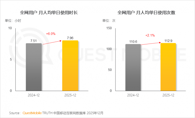 QuestMobile数据显示,2025年12月,全网用户月人均单日使用时长及次数分别为7.96小时和112.9次,较去年同期分别提升6.0%、2.1%,用户粘性加深。