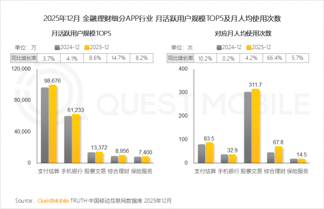 2.2 支付结算与手机银行提供基础设施类服务,流量增长稳健;主动配置浪潮助推交易、理财类APP用户规模增长;综合理财平台与生活场景的深度融合,带来使用频次爆发式增长