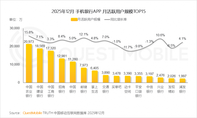 QuestMobile数据显示,中国农业银行、邮储银行、兴业银行APP月活跃用户规模均实现双位数同比增长,增速分别为15.8%、12.1%和10.6%。