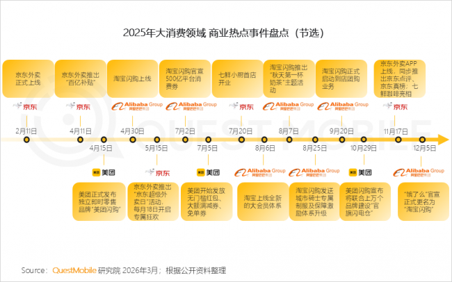 3.1 2025年大消费领域进入巨头深度博弈与生态重构期,京东、阿里巴巴、美团三大阵营通过新业务上线、补贴加码、品牌升级等多重动作,推动行业向 “万物到家” 的即时消费生态加速演进