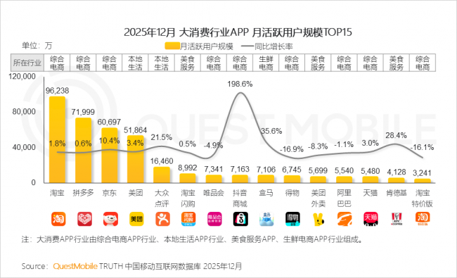 QuestMobile数据显示,2025年12月,大消费行业月活跃用户规模TOP15 APP中,抖音商城、盒马、肯德基、大众点评APP同比增速较高,分别为198.6%、35.6%、28.4%、21.5%。