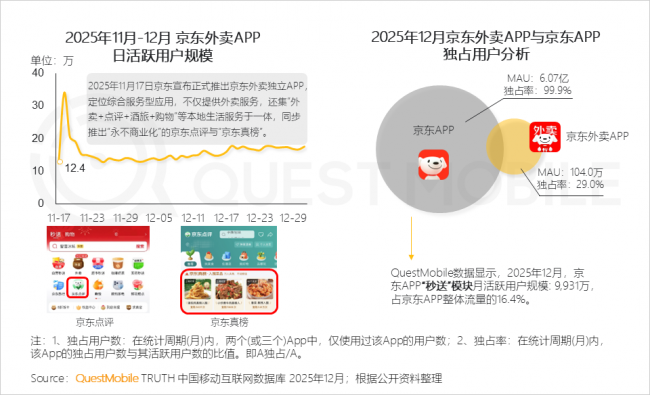 QuestMobile数据显示,2025年12月,京东APP“秒送”模块月活跃用户规模达到9,931万,京东外卖APP月活跃用户规模达到104万。