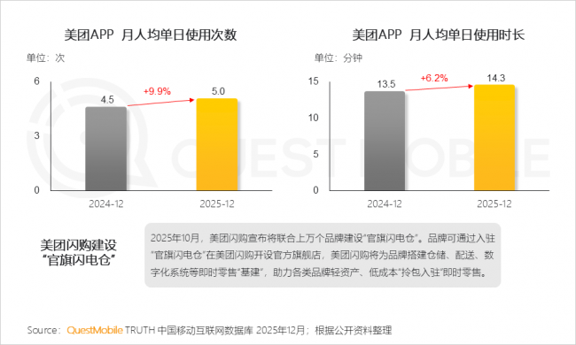 QuestMobile数据显示,2025年12月,美团APP月人均单日使用次数同比增长9.9%,达到5.0次,月人均单日使用时长同比增长6.2%,达到14.3分钟。
