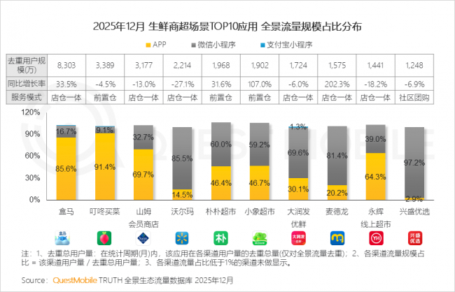 QuestMobile数据显示,2025年12月,生鲜商超TOP10应用全景流量均超过千万。