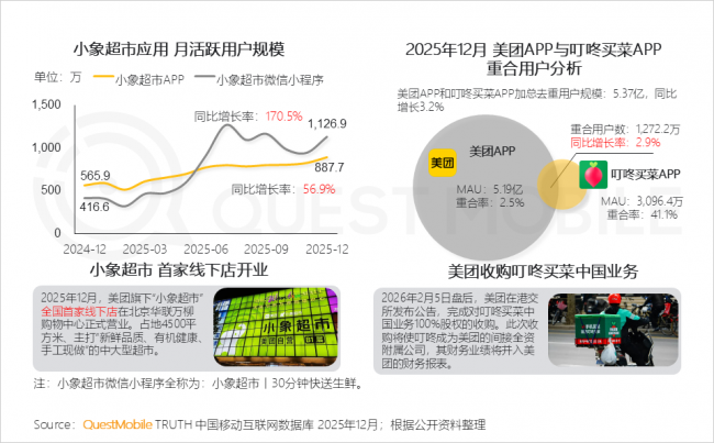 QuestMobile数据显示,2025年12月,美团和叮咚买菜APP加总去重用户规模已达到5.37亿,同比增长3.2%。