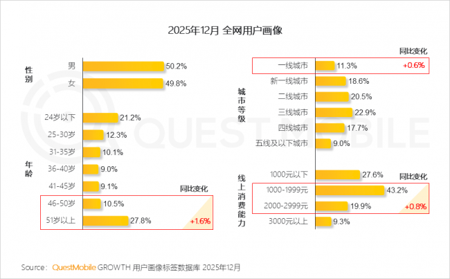 2.1 从互联网用户结构来看,银发群体持续扩容、高线城市集聚,用户线上中高消费力进一步提升