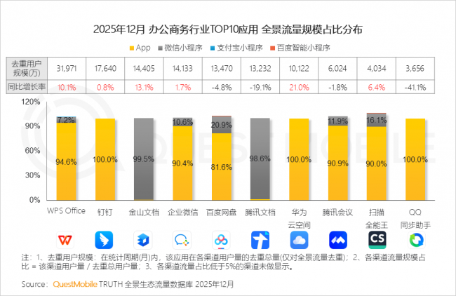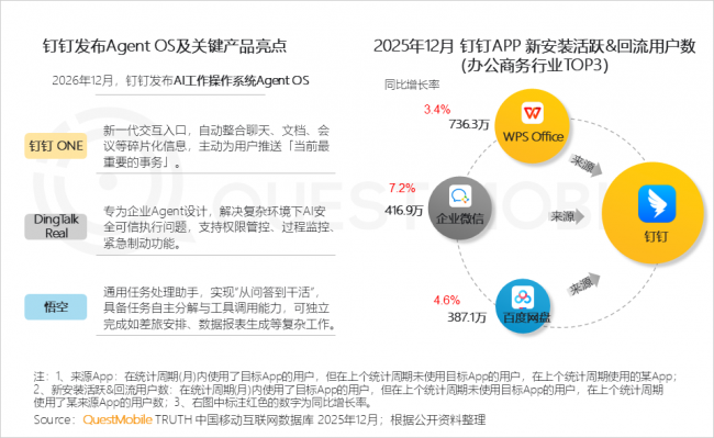 QuestMobile数据显示,2025年12月,钉钉APP新安装活跃&回流用户中来自WPS Office、企业微信、百度网盘APP的用户规模分别为736.3万、416.9万、387.1万,且与去年同期相比均增长。