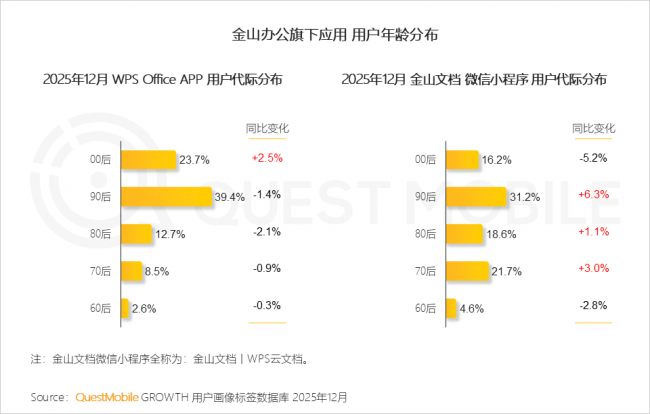 QuestMobile数据显示,2025年12月,WPS Office APP用户偏向00后、90后,占比共计达到63%,其中00后占比同比增长2.5个百分点,金山文档微信小程序用户偏向90后、80后、70后,占比共计达到71.5%,各代际同比去年均有所增长。