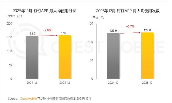 QuestMobile数据显示,2025年12月,钉钉APP月人均使用时长同比增长2.0%,达到156.9分钟,月人均使用次数同比增长0.7%,达到124.8次。